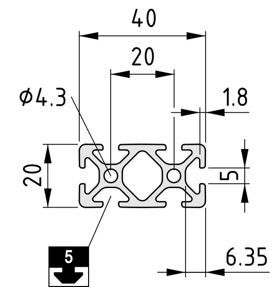 פרופיל מודולרי מסגסוגת אלומיניום T5-6063 גובה 20 מ״מ, רוחב 40 מ״מ, רוחב חריץ 5 מ״מ. אורך יחידה וכמות על פי דרישת הלקוח.