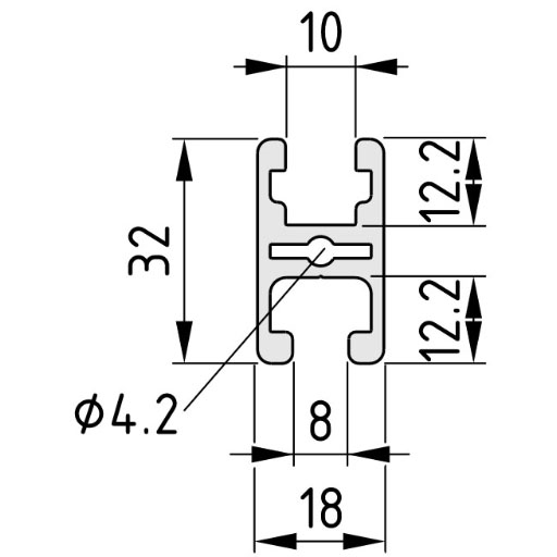 פרופיל מודולרי מסגסוגת אלומיניום T5-6063 גובה 18 מ״מ, רוחב 32 מ״מ, רוחב חריץ 8 מ״מ. אורך יחידה וכמות על פי דרישת הלקוח.