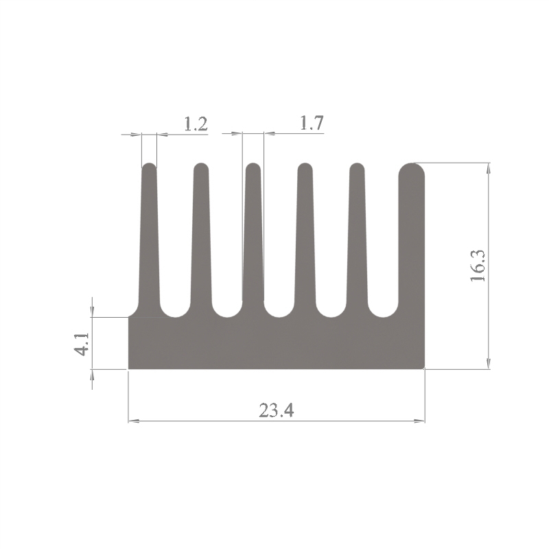 מפזר חום סטנדרטי (Heat Sink) מסגסוגת אלומיניום T5-6063, בתקן EN 755 E, גובה 16.3 מ״מ, רוחב 23.4 מ״מ, עובי צלע 1.2 מ״מ, אורך יחידה וכמות על פי דרישת הלקוח.