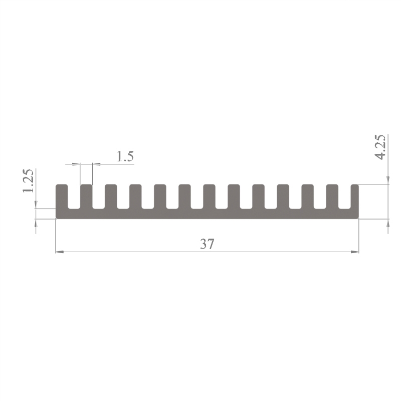 מפזר חום סטנדרטי (Heat Sink) מסגסוגת אלומיניום T5-6063, בתקן EN 755 E, גובה 4.25 מ״מ, רוחב 37 מ״מ, עובי צלע 1.5 מ״מ, אורך יחידה וכמות על פי דרישת הלקוח.