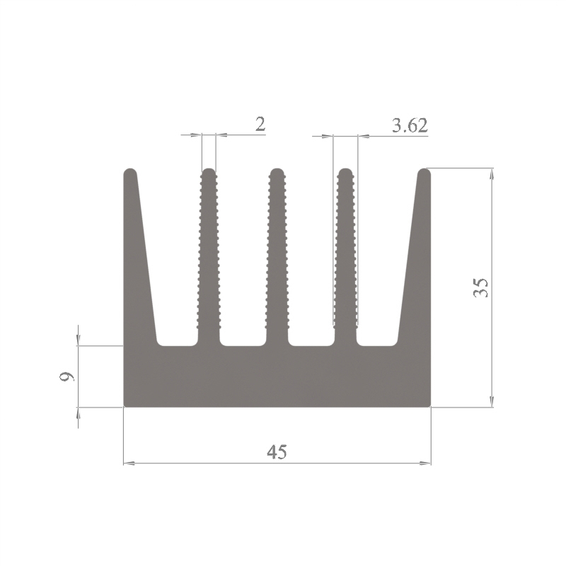 מפזר חום סטנדרטי (Heat Sink) מסגסוגת אלומיניום T5-6063, בתקן EN 755 E, גובה 35 מ״מ, רוחב 45 מ״מ, עובי צלע 2 מ״מ, אורך יחידה וכמות על פי דרישת הלקוח.