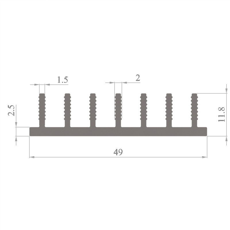 מפזר חום סטנדרטי (Heat Sink) מסגסוגת אלומיניום T5-6063, בתקן EN 755 E, גובה 11.8 מ״מ, רוחב 49 מ״מ, עובי צלע 1.5 מ״מ, אורך יחידה וכמות על פי דרישת הלקוח.
