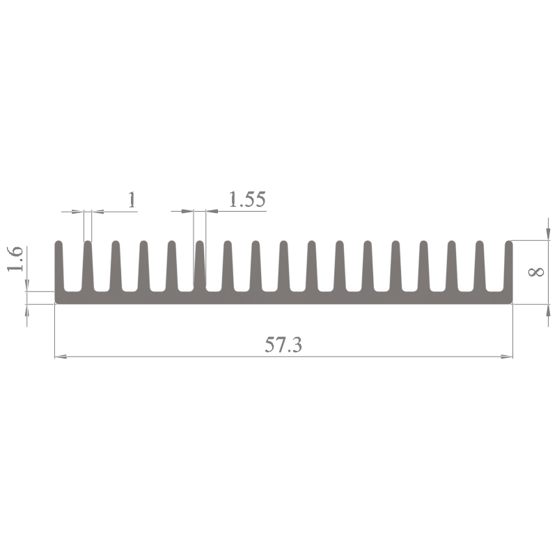 מפזר חום סטנדרטי (Heat Sink) מסגסוגת אלומיניום T5-6063, בתקן EN 755 E, גובה 8 מ״מ, רוחב 57.3 מ״מ, עובי צלע 1 מ״מ, אורך יחידה וכמות על פי דרישת הלקוח.