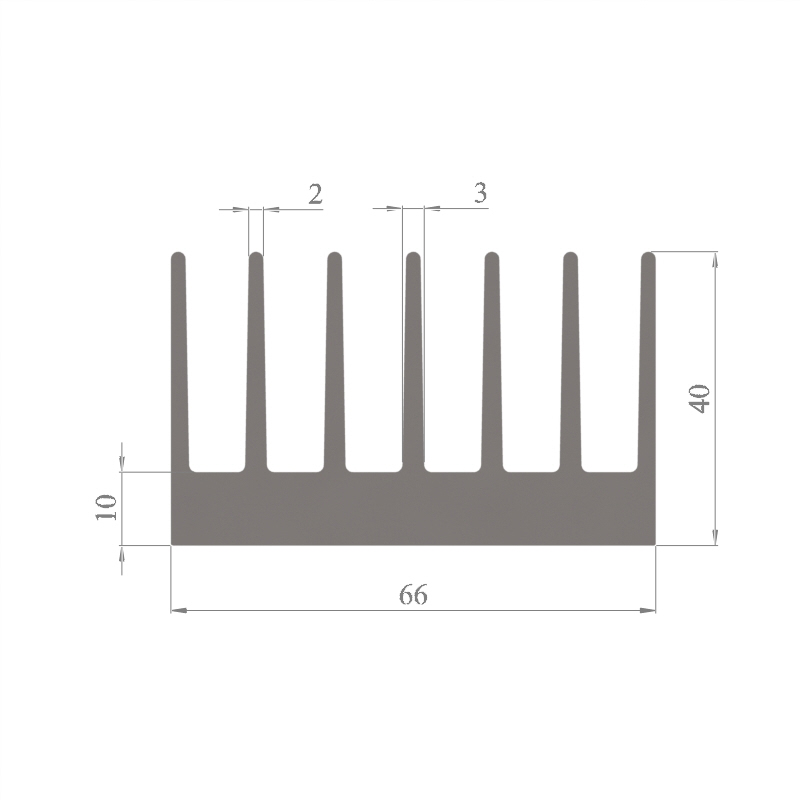 מפזר חום סטנדרטי (Heat Sink) מסגסוגת אלומיניום T5-6063, בתקן EN 755 E, גובה 40 מ״מ, רוחב 66 מ״מ, עובי צלע 2 מ״מ, אורך יחידה וכמות על פי דרישת הלקוח.