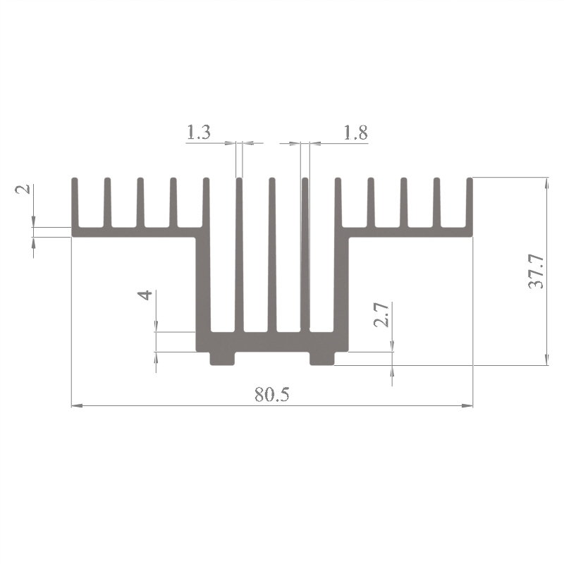 מפזר חום סטנדרטי (Heat Sink) מסגסוגת אלומיניום T5-6063, בתקן EN 755 E, גובה 37.7 מ״מ, רוחב 80.5 מ״מ, עובי צלע 1.3 מ״מ, אורך יחידה וכמות על פי דרישת הלקוח.