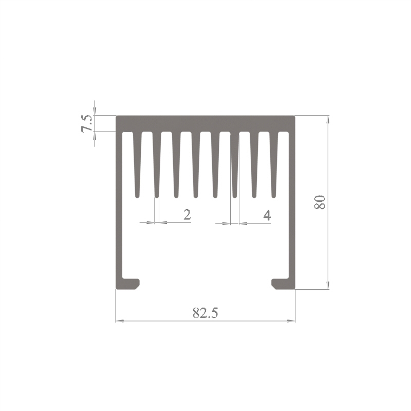 מפזר חום סטנדרטי (Heat Sink) מסגסוגת אלומיניום T5-6063, בתקן EN 755 E, גובה 80 מ״מ, רוחב 82.5 מ״מ, עובי צלע 2 מ״מ, אורך יחידה וכמות על פי דרישת הלקוח.
