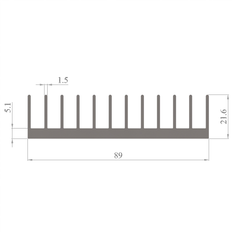 מפזר חום סטנדרטי (Heat Sink) מסגסוגת אלומיניום T5-6063, בתקן EN 755 E, גובה 21.6 מ״מ, רוחב 89 מ״מ, עובי צלע 1.5 מ״מ, אורך יחידה וכמות על פי דרישת הלקוח.