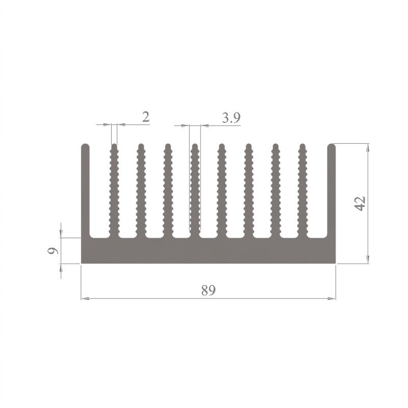 מפזר חום סטנדרטי (Heat Sink) מסגסוגת אלומיניום T5-6063, בתקן EN 755 E, גובה 42 מ״מ, רוחב 89 מ״מ, עובי צלע 2 מ״מ, אורך יחידה וכמות על פי דרישת הלקוח.