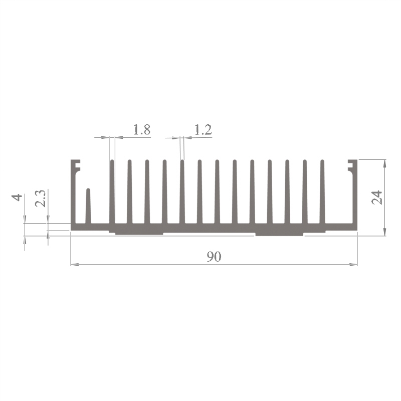 מפזר חום סטנדרטי (Heat Sink) מסגסוגת אלומיניום T5-6063, בתקן EN 755 E, גובה 24 מ״מ, רוחב 90 מ״מ, עובי צלע 1.2 מ״מ, אורך יחידה וכמות על פי דרישת הלקוח.