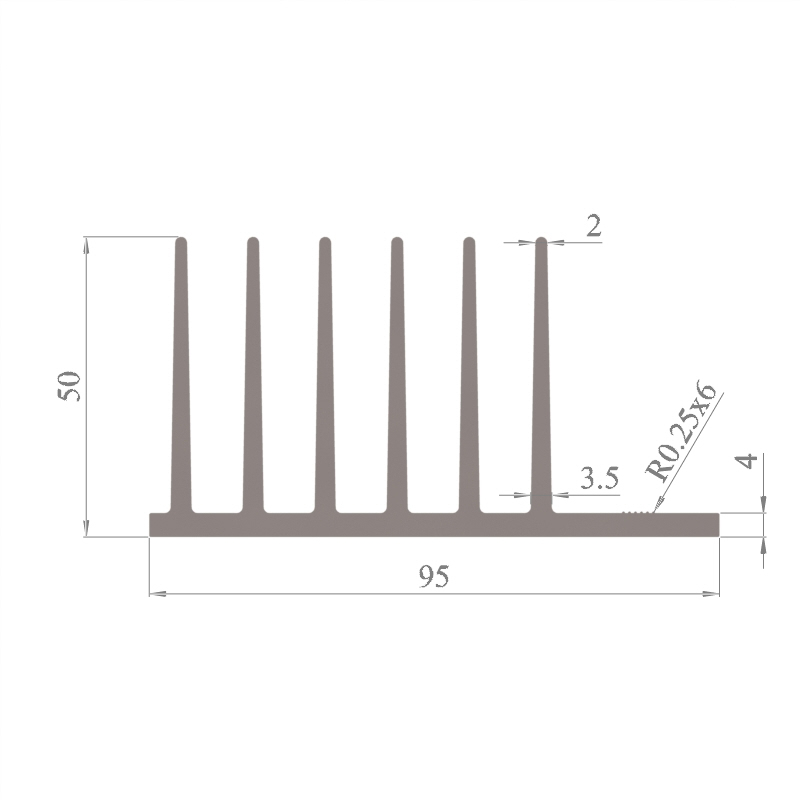 מפזר חום סטנדרטי (Heat Sink) מסגסוגת אלומיניום T5-6063, בתקן EN 755 E, גובה 50 מ״מ, רוחב 95 מ״מ, עובי צלע 2 מ״מ, אורך יחידה וכמות על פי דרישת הלקוח.