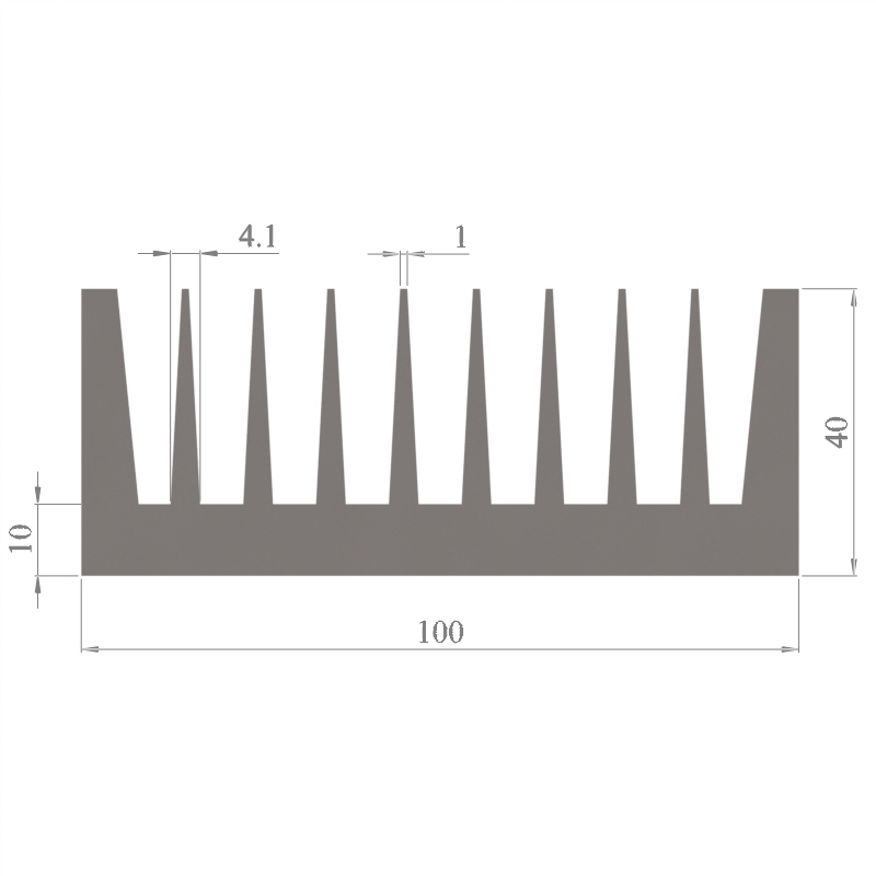 מפזר חום סטנדרטי (Heat Sink) מסגסוגת אלומיניום T5-6063, בתקן EN 755 E, גובה 40 מ״מ, רוחב 100 מ״מ, עובי צלע 1 מ״מ, אורך יחידה וכמות על פי דרישת הלקוח.
