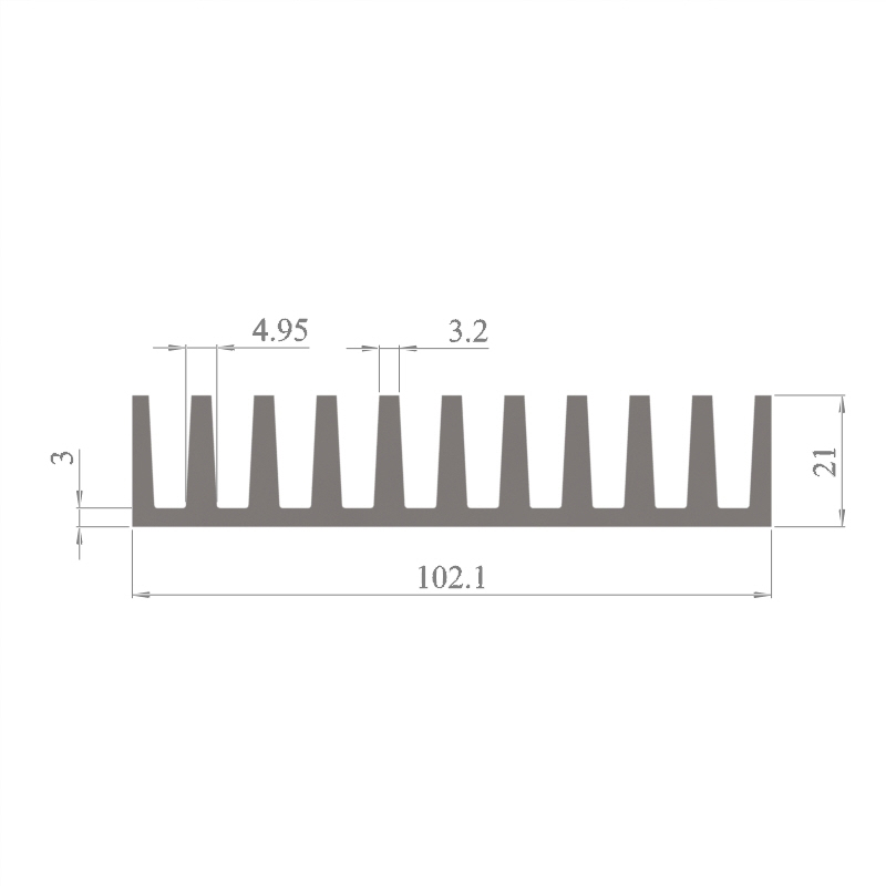 מפזר חום סטנדרטי (Heat Sink) מסגסוגת אלומיניום T5-6063, בתקן EN 755 E, גובה 21 מ״מ, רוחב 102.1 מ״מ, עובי צלע 3.2 מ״מ, אורך יחידה וכמות על פי דרישת הלקוח.