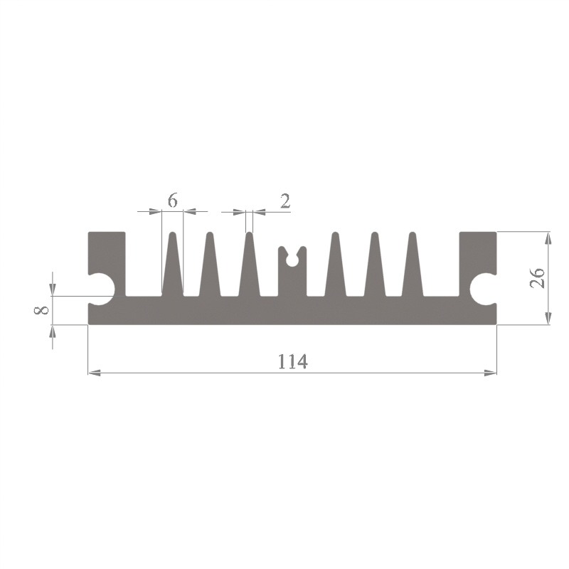 מפזר חום סטנדרטי (Heat Sink) מסגסוגת אלומיניום T5-6063, בתקן EN 755 E, גובה 26 מ״מ, רוחב 114 מ״מ, עובי צלע 2 מ״מ, אורך יחידה וכמות על פי דרישת הלקוח.