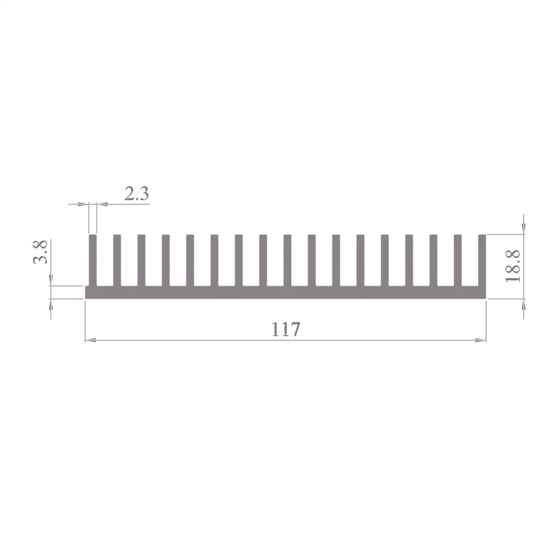 מפזר חום סטנדרטי (Heat Sink) מסגסוגת אלומיניום T5-6063, בתקן EN 755 E, גובה 18.8 מ״מ, רוחב 117 מ״מ, עובי צלע 2.3 מ״מ, אורך יחידה וכמות על פי דרישת הלקוח.