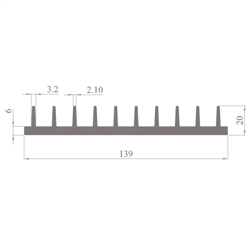 מפזר חום סטנדרטי (Heat Sink) מסגסוגת אלומיניום T5-6063, בתקן EN 755 E, גובה 20 מ״מ, רוחב 139 מ״מ, עובי צלע 2.1 מ״מ, אורך יחידה וכמות על פי דרישת הלקוח.