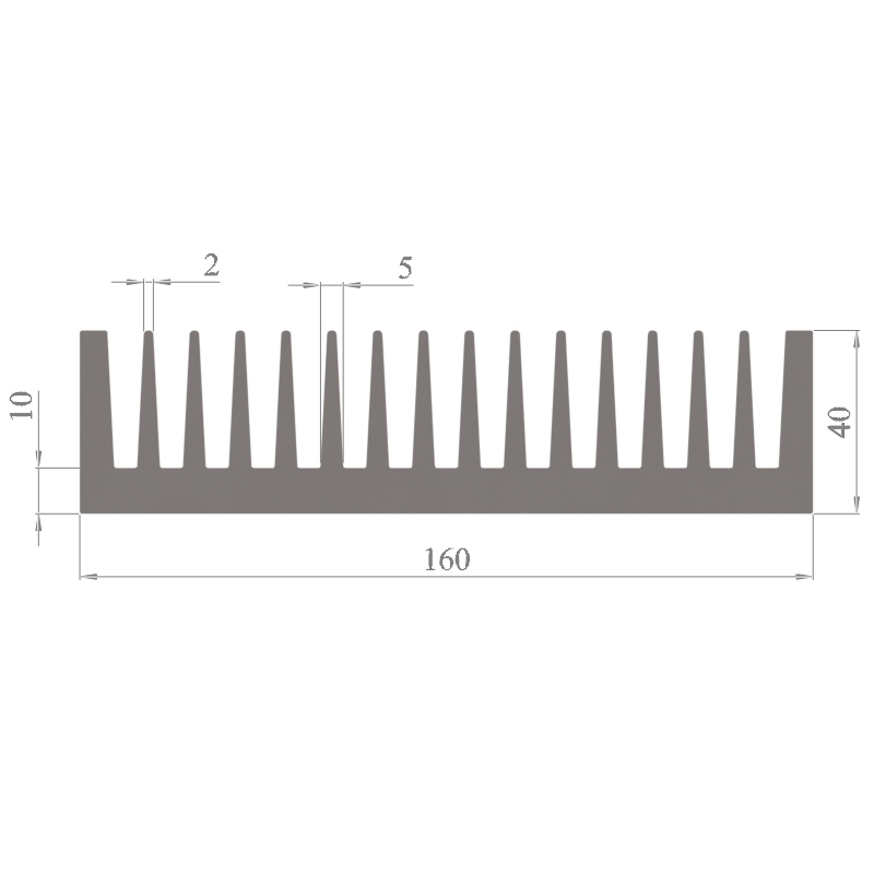 מפזר חום סטנדרטי (Heat Sink) מסגסוגת אלומיניום T5-6063, בתקן EN 755 E, גובה 40 מ״מ, רוחב 160 מ״מ, עובי צלע 2 מ״מ, אורך יחידה וכמות על פי דרישת הלקוח.
