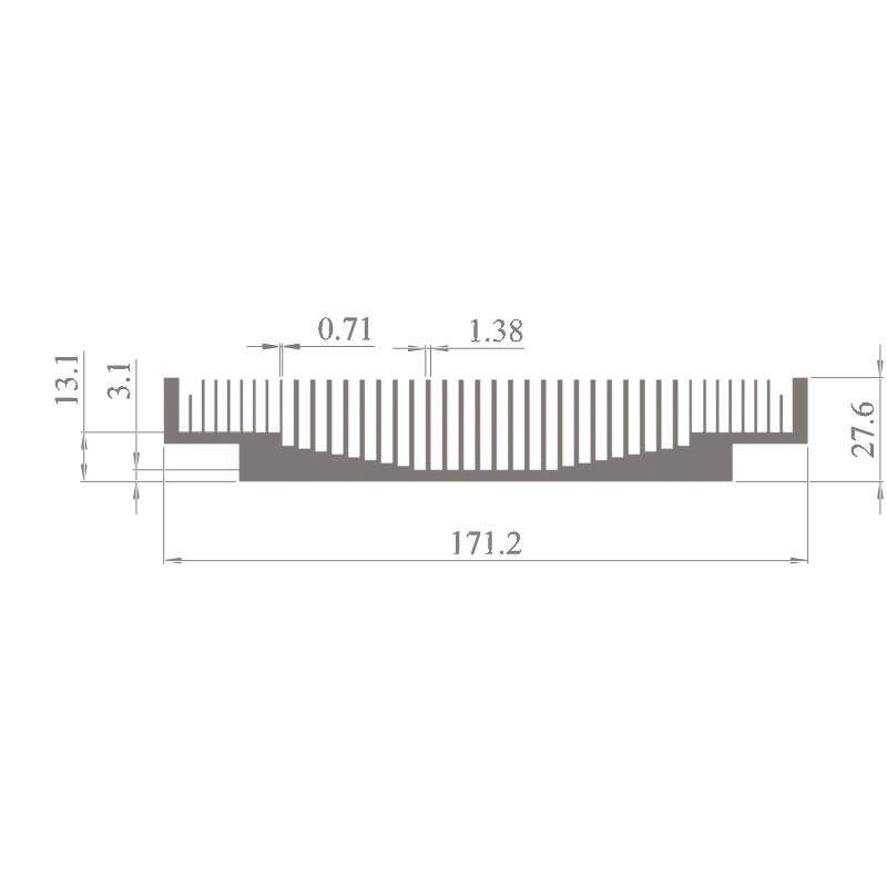 מפזר חום סטנדרטי (Heat Sink) מסגסוגת אלומיניום T5-6063, בתקן EN 755 E, גובה 27.6 מ״מ, רוחב 171.2 מ״מ, עובי צלע 0.71 מ״מ, אורך יחידה וכמות על פי דרישת הלקוח.