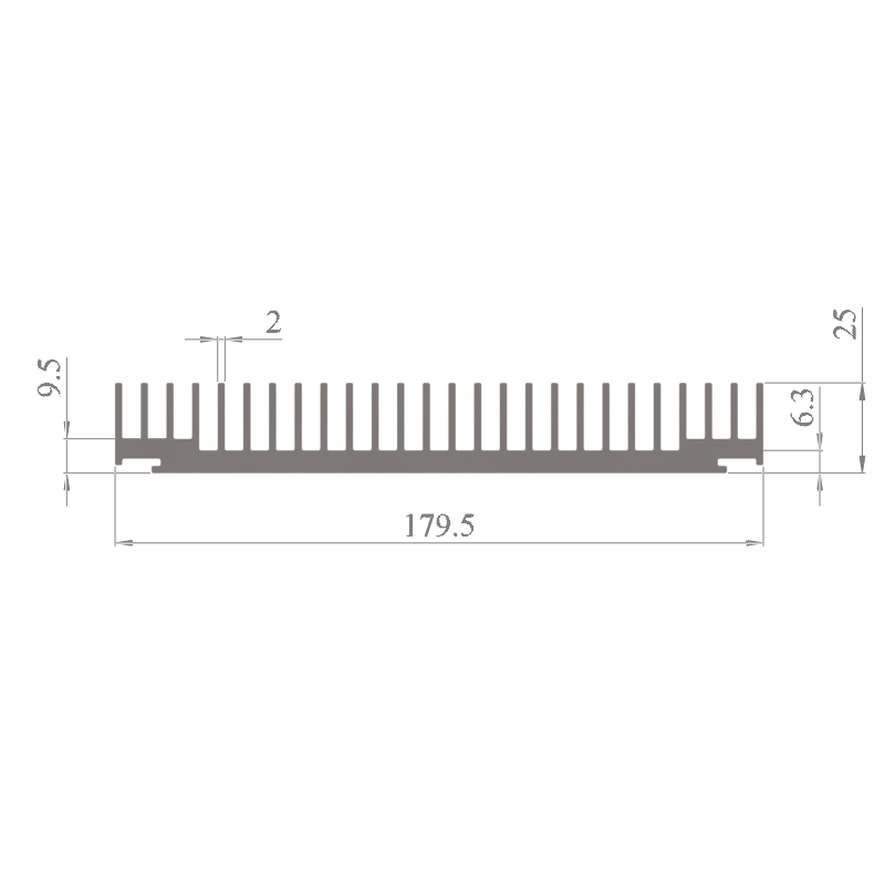 מפזר חום סטנדרטי (Heat Sink) מסגסוגת אלומיניום T5-6063, בתקן EN 755 E, גובה 25 מ״מ, רוחב 179.5 מ״מ, עובי צלע 2 מ״מ, אורך יחידה וכמות על פי דרישת הלקוח.