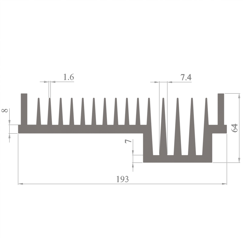 מפזר חום סטנדרטי (Heat Sink) מסגסוגת אלומיניום T5-6063, בתקן EN 755 E, גובה 64 מ״מ, רוחב 193 מ״מ, עובי צלע 1.6 מ״מ, אורך יחידה וכמות על פי דרישת הלקוח.