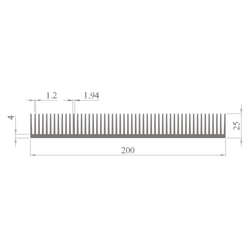 מפזר חום סטנדרטי (Heat Sink) מסגסוגת אלומיניום T5-6063, בתקן EN 755 E, גובה 25 מ״מ, רוחב 200 מ״מ, עובי צלע 1.2 מ״מ, אורך יחידה וכמות על פי דרישת הלקוח.