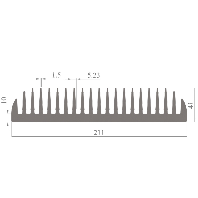 מפזר חום סטנדרטי (Heat Sink) מסגסוגת אלומיניום T5-6063, בתקן EN 755 E, גובה 41 מ״מ, רוחב 211 מ״מ, עובי צלע 1.5 מ״מ, אורך יחידה וכמות על פי דרישת הלקוח.