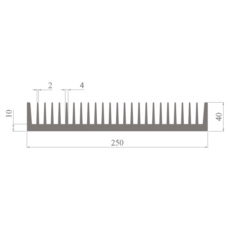 מפזר חום סטנדרטי (Heat Sink) מסגסוגת אלומיניום T5-6063, בתקן EN 755 E, גובה 40 מ״מ, רוחב 250 מ״מ, עובי צלע 2 מ״מ, אורך יחידה וכמות על פי דרישת הלקוח.