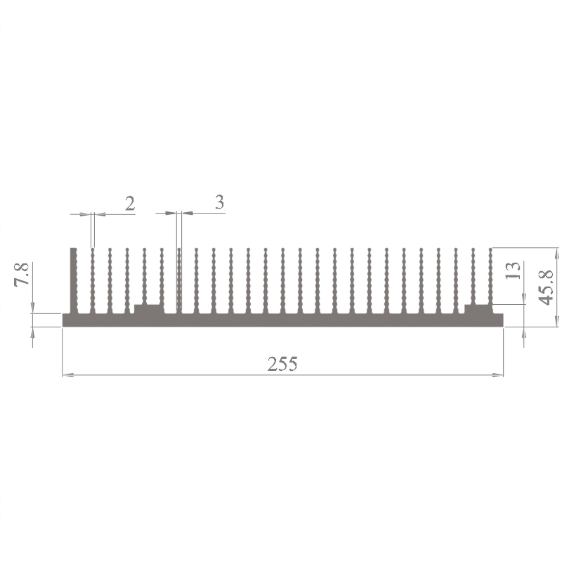 מפזר חום סטנדרטי (Heat Sink) מסגסוגת אלומיניום T5-6063, בתקן EN 755 E, גובה 45.8 מ״מ, רוחב 255 מ״מ, עובי צלע 2 מ״מ, אורך יחידה וכמות על פי דרישת הלקוח.