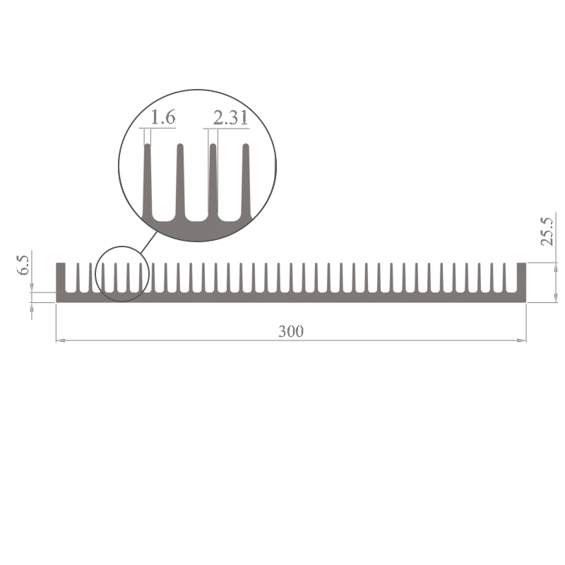 מפזר חום סטנדרטי (Heat Sink) מסגסוגת אלומיניום T5-6063, בתקן EN 755 E, גובה 25 מ״מ, רוחב 300 מ״מ, עובי צלע 1.6 מ״מ, אורך יחידה וכמות על פי דרישת הלקוח.