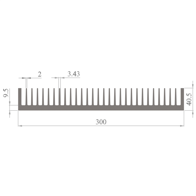 מפזר חום סטנדרטי (Heat Sink) מסגסוגת אלומיניום T5-6063, בתקן EN 755 E, גובה 40.5 מ״מ, רוחב 300 מ״מ, עובי צלע 2 מ״מ, אורך יחידה וכמות על פי דרישת הלקוח.