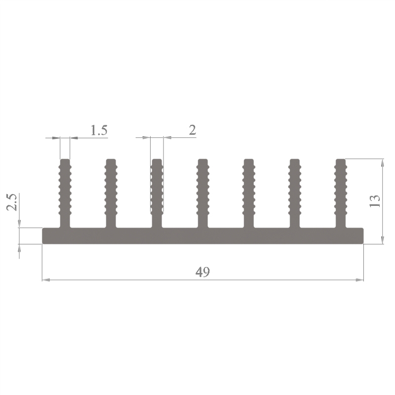 מפזר חום סטנדרטי (Heat Sink) מסגסוגת אלומיניום T5-6063, בתקן EN 755 E, גובה 13 מ״מ, רוחב 49 מ״מ, עובי צלע 1.5 מ״מ, אורך יחידה וכמות על פי דרישת הלקוח.