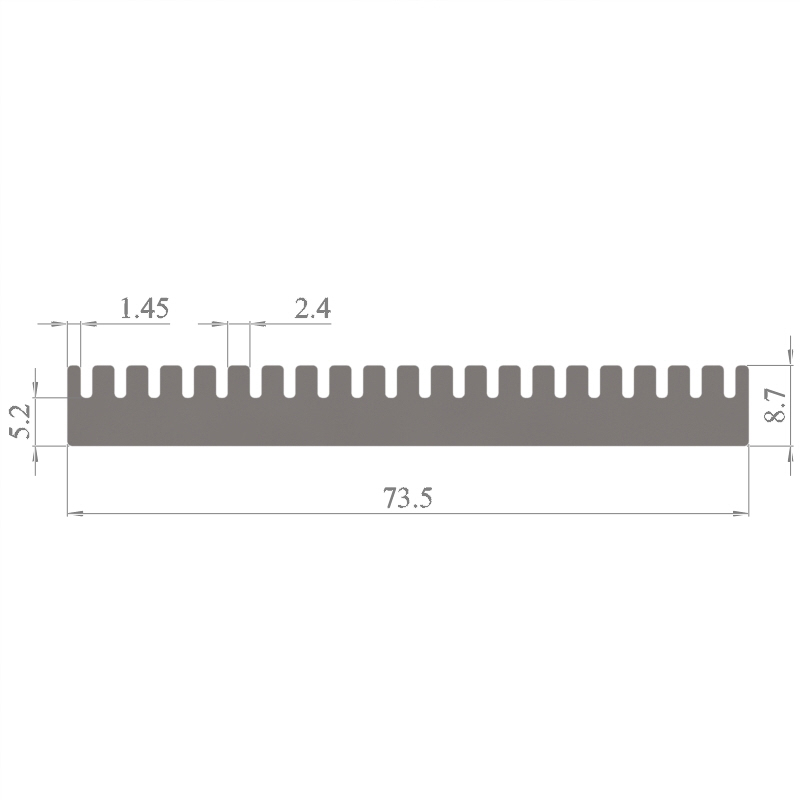 מפזר חום סטנדרטי (Heat Sink) מסגסוגת אלומיניום T5-6063, בתקן EN 755 E, גובה 8.7 מ״מ, רוחב 73.5 מ״מ, עובי צלע 1.45 מ״מ, אורך יחידה וכמות על פי דרישת הלקוח.