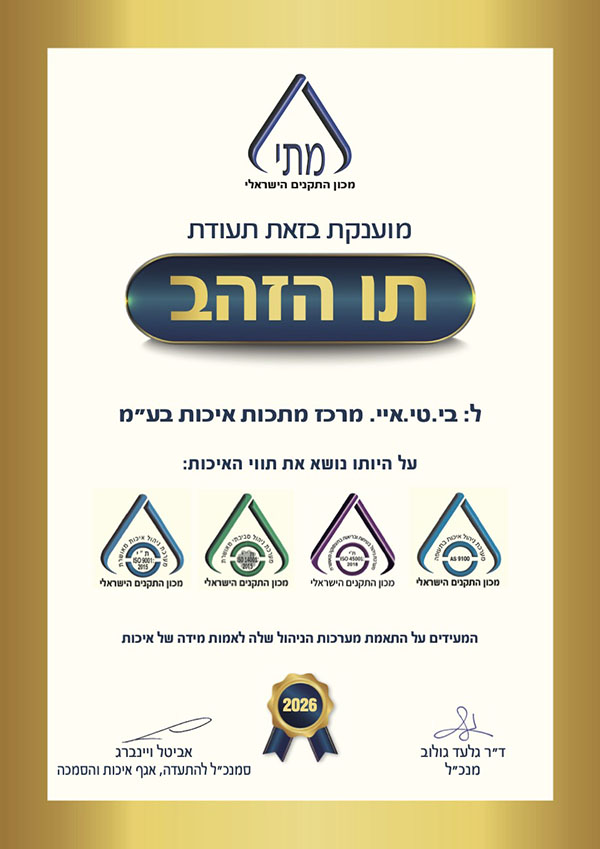 מערך האיכות והביקורת המתקדם שלנו תואם את תקני האיכות הגבוהים ביותר – AS9100,(תקן תעופתי), ISO14001 (תקן בטיחות ובריאות העובדים) ISO45001 (תקן איכות הסביבה)…
