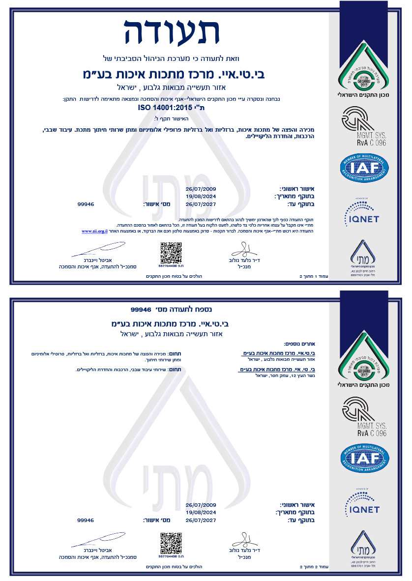 אנחנו מחויבים לשמירה על איכות הסביבה ולכן פועלים תחת סט של נהלים והנחיות למימוש מערכת ניהול סביבתי יעיל בארגון, בהתאם לתקן ISO14001.