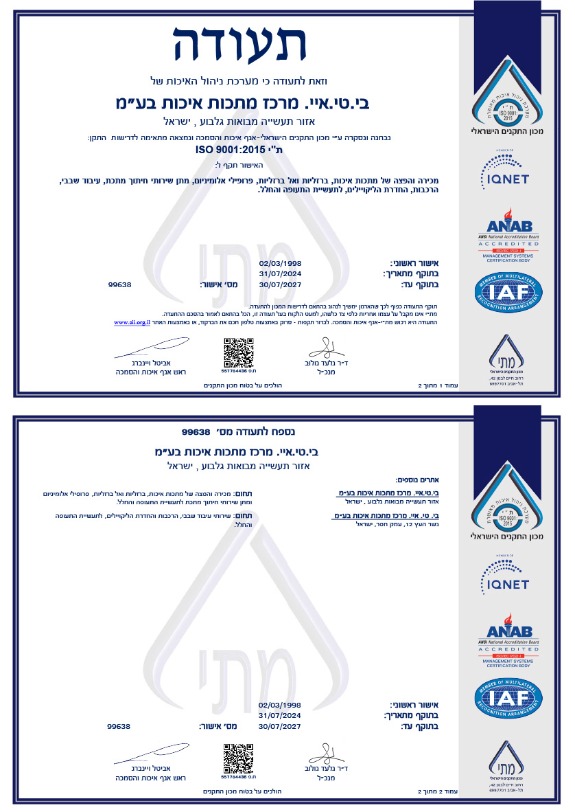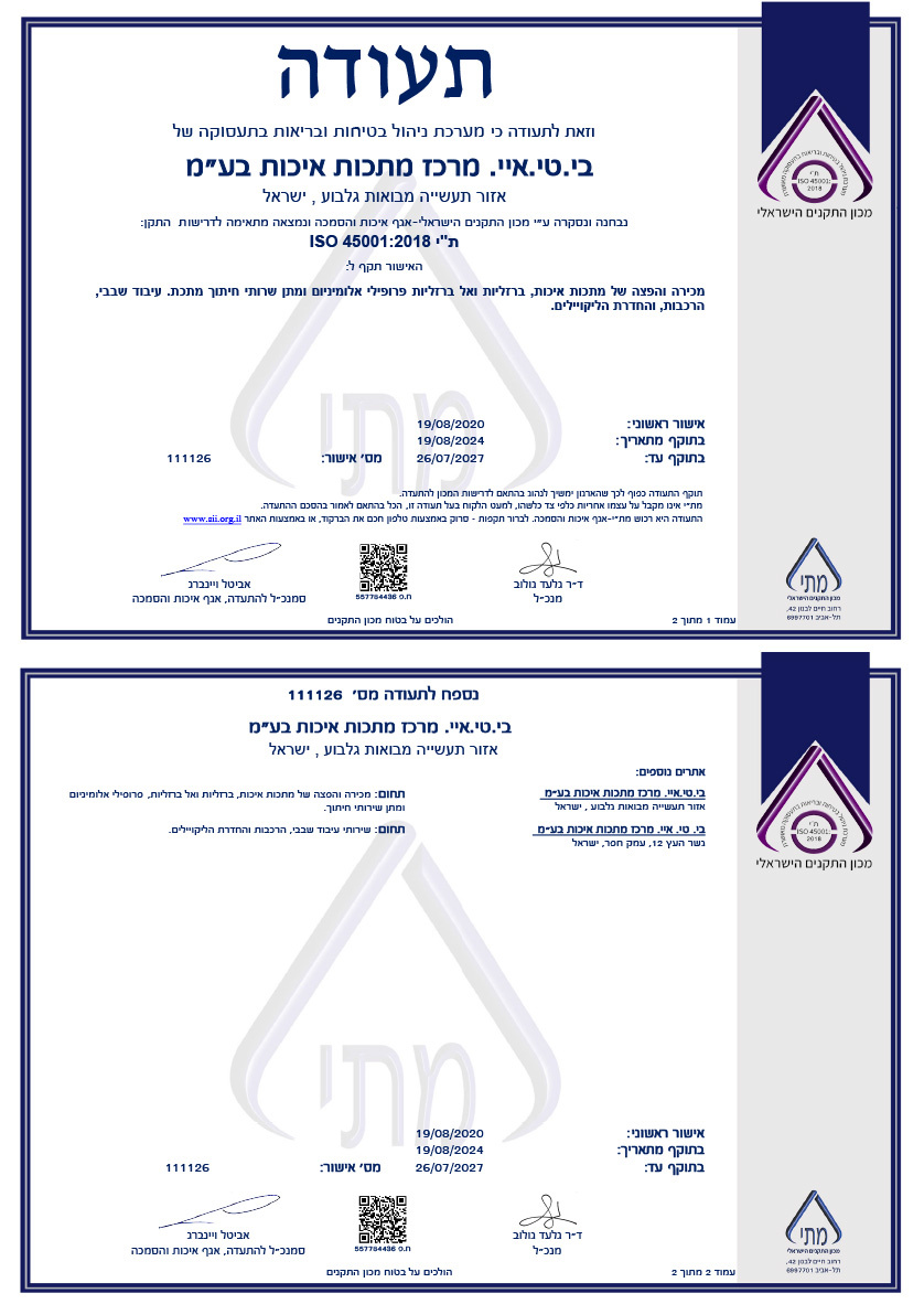 בסביבת עבודה בטוחה ובריאה, יכולים עובדינו לייצר במינימום תקלות, מוצרי איכות שישביעו את רצון הלקוח. כחלק מגישה זו, הוסמכה BTI…