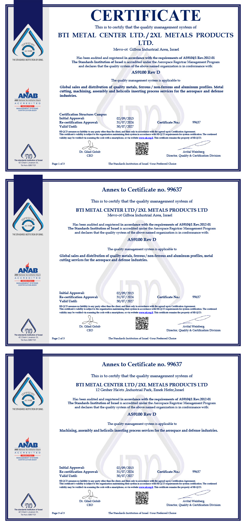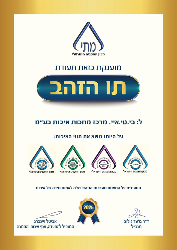 מערך האיכות והביקורת המתקדם שלנו תואם את תקני האיכות הגבוהים ביותר – AS9100,(תקן תעופתי), ISO14001 (תקן בטיחות ובריאות העובדים) ISO45001 (תקן איכות הסביבה)…